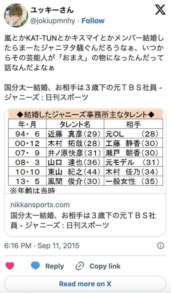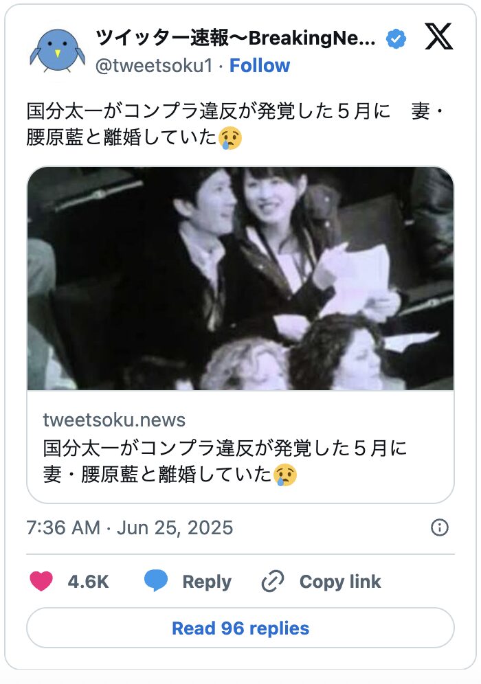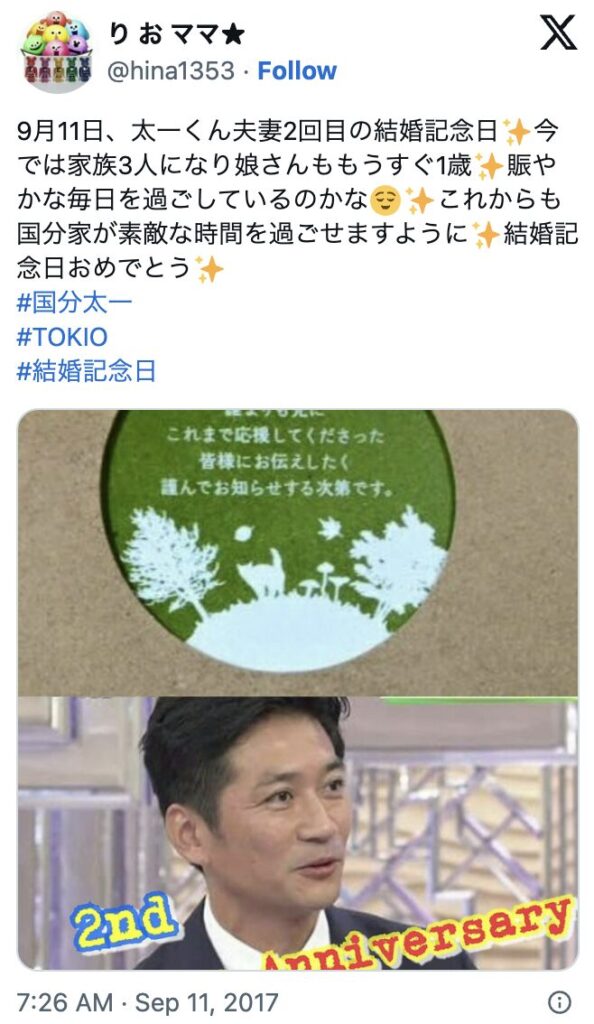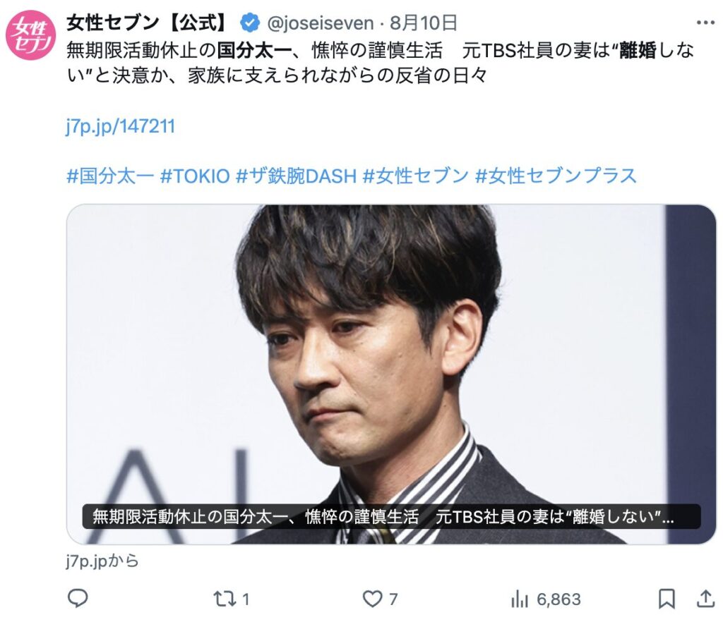 ただし、SNSで、国分太一さんが5月に離婚していたという投稿は流れています。