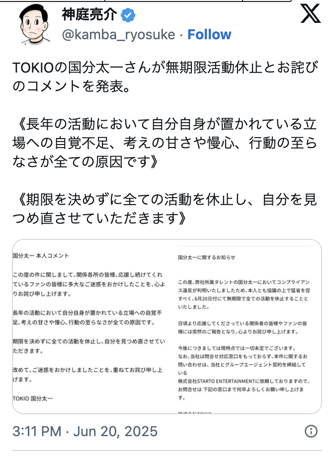 国分太一さんの活動休止と同時に、「TOKIO」の解散も正式発表されましたね。
