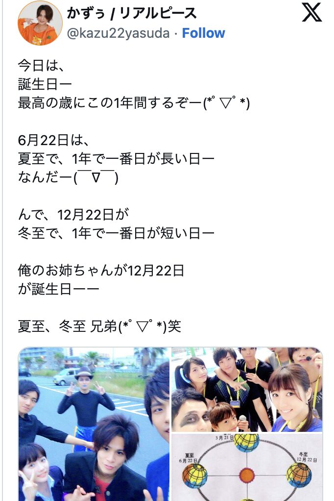 かずぅさんの兄弟、お姉ちゃんとのエピソードについてSNSの投稿にもあげていました。