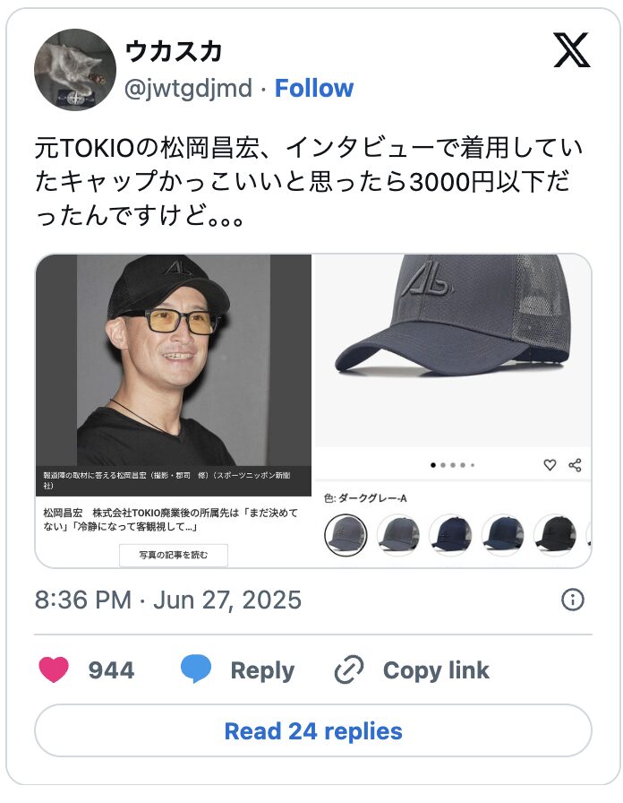 そんな会見で、松岡昌宏さんが着用していた“キャップ”にも注目が集まっていました。